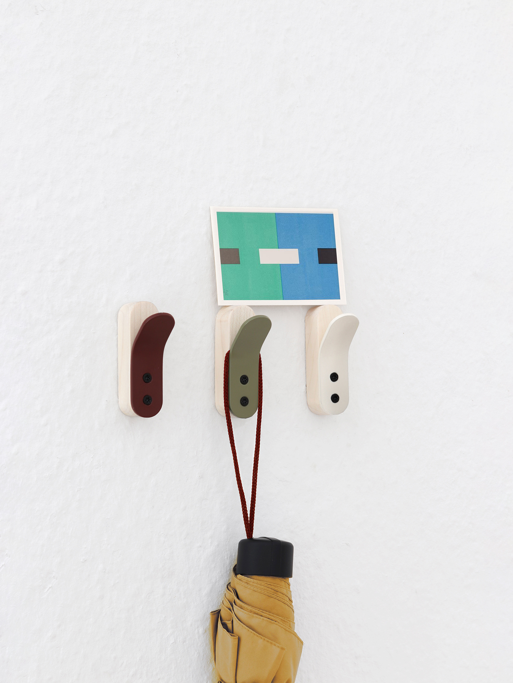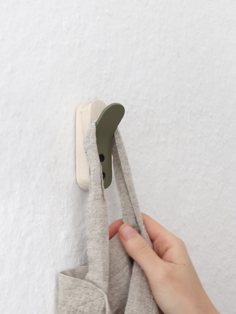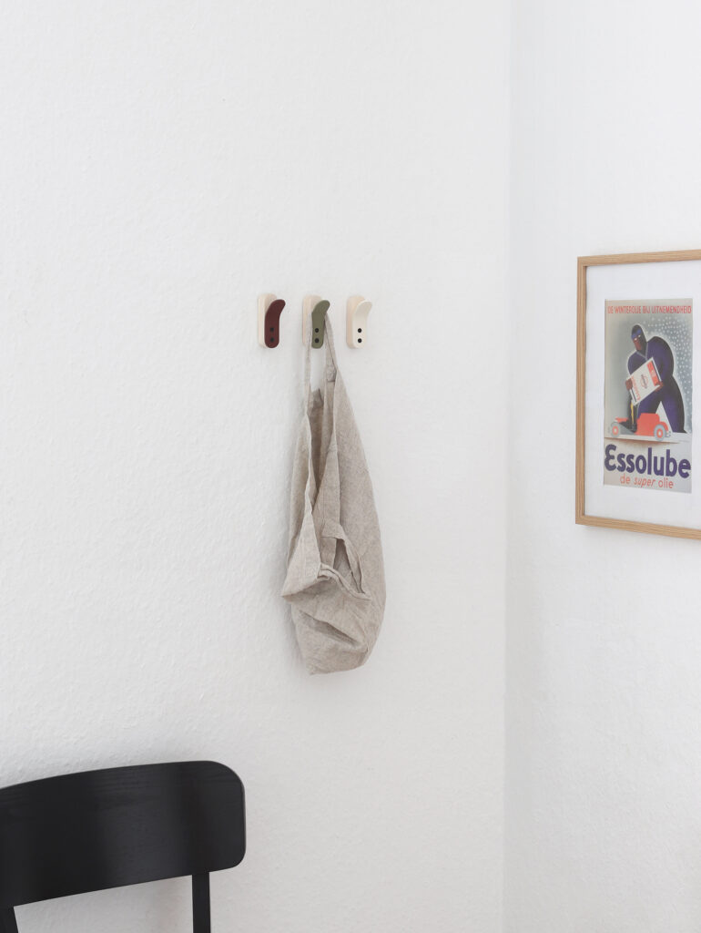 Curved Wall hook Where the line bends, function appears Year: 2025 Type: Wall hook Material: Walnut (waxed), Powder-coated steel Size: W25 × D51 × H84 mm Curved Wall Hook combines a single curved steel plate with a wooden block. By bending the steel outward, the hook emerges directly from the form itself, creating a hanging function with minimal structure.