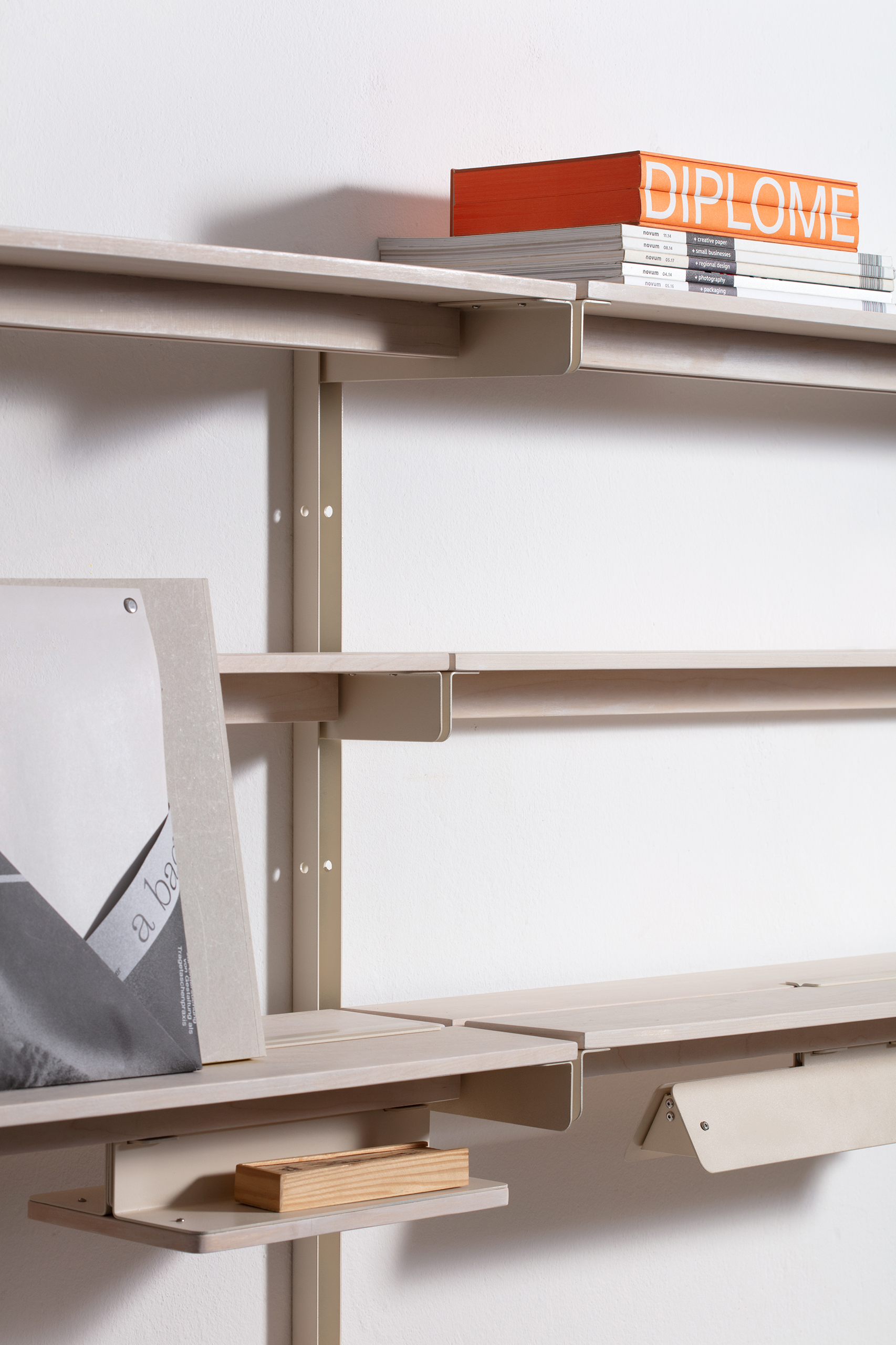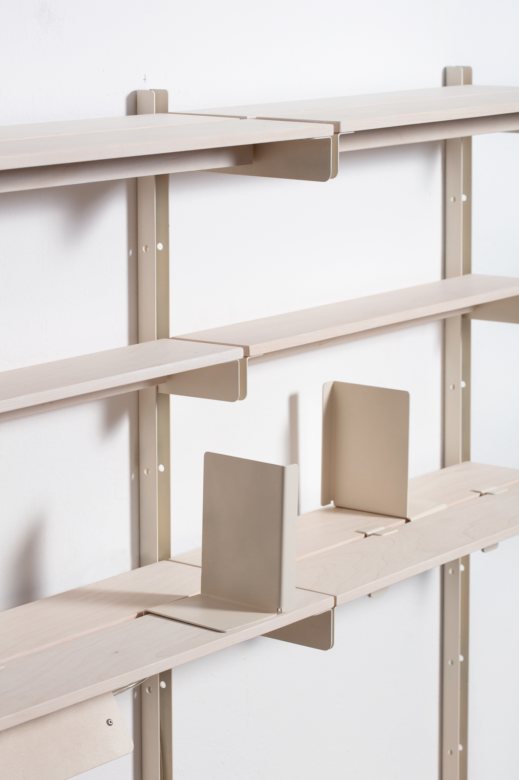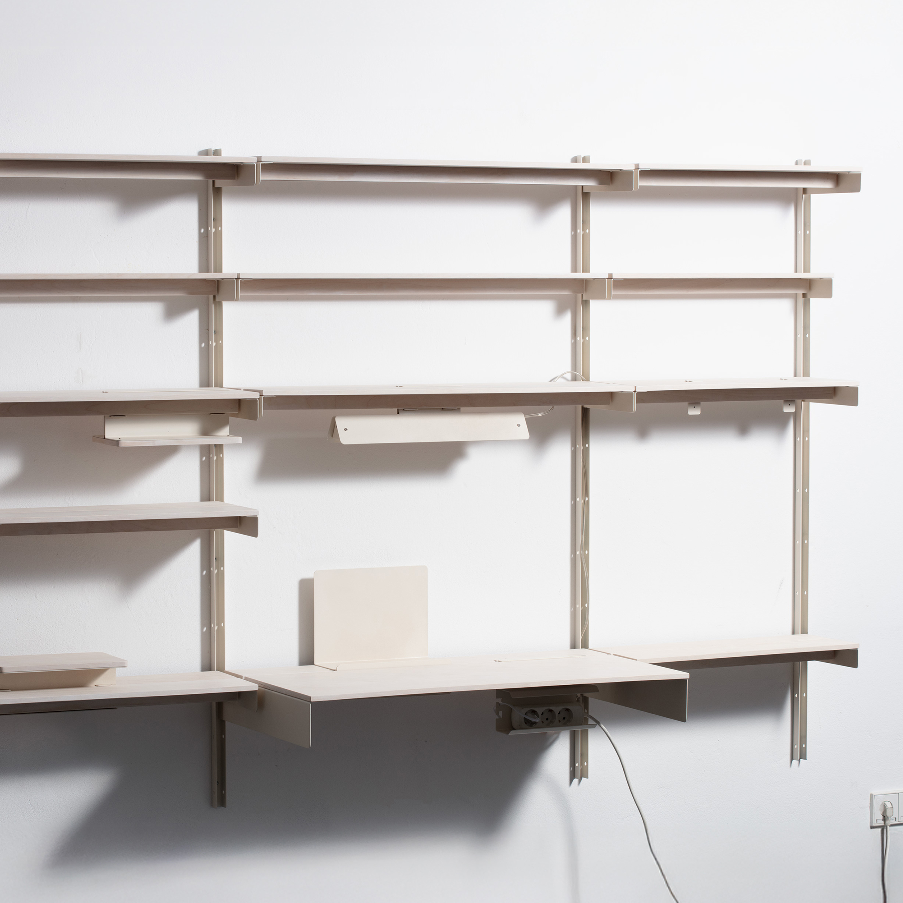 At the centre of the shelving system runs a continuous slit into which modules can be attached from above or below. Through this opening, various add-on elements such as a mini table, a light, a hook, a power outlet, or a bookend can be integrated. This allows the system to be configured according to different needs and adapted to a range of situations.