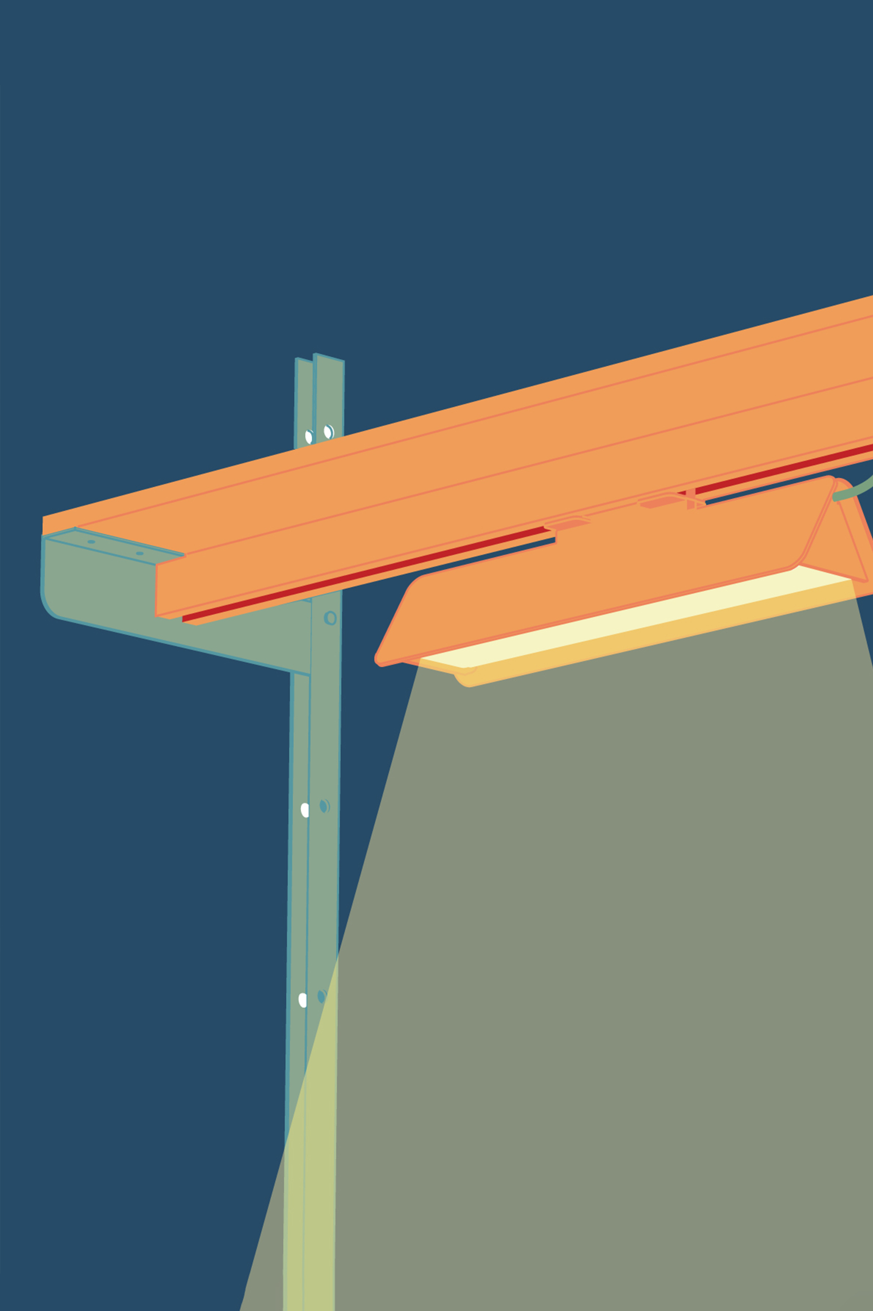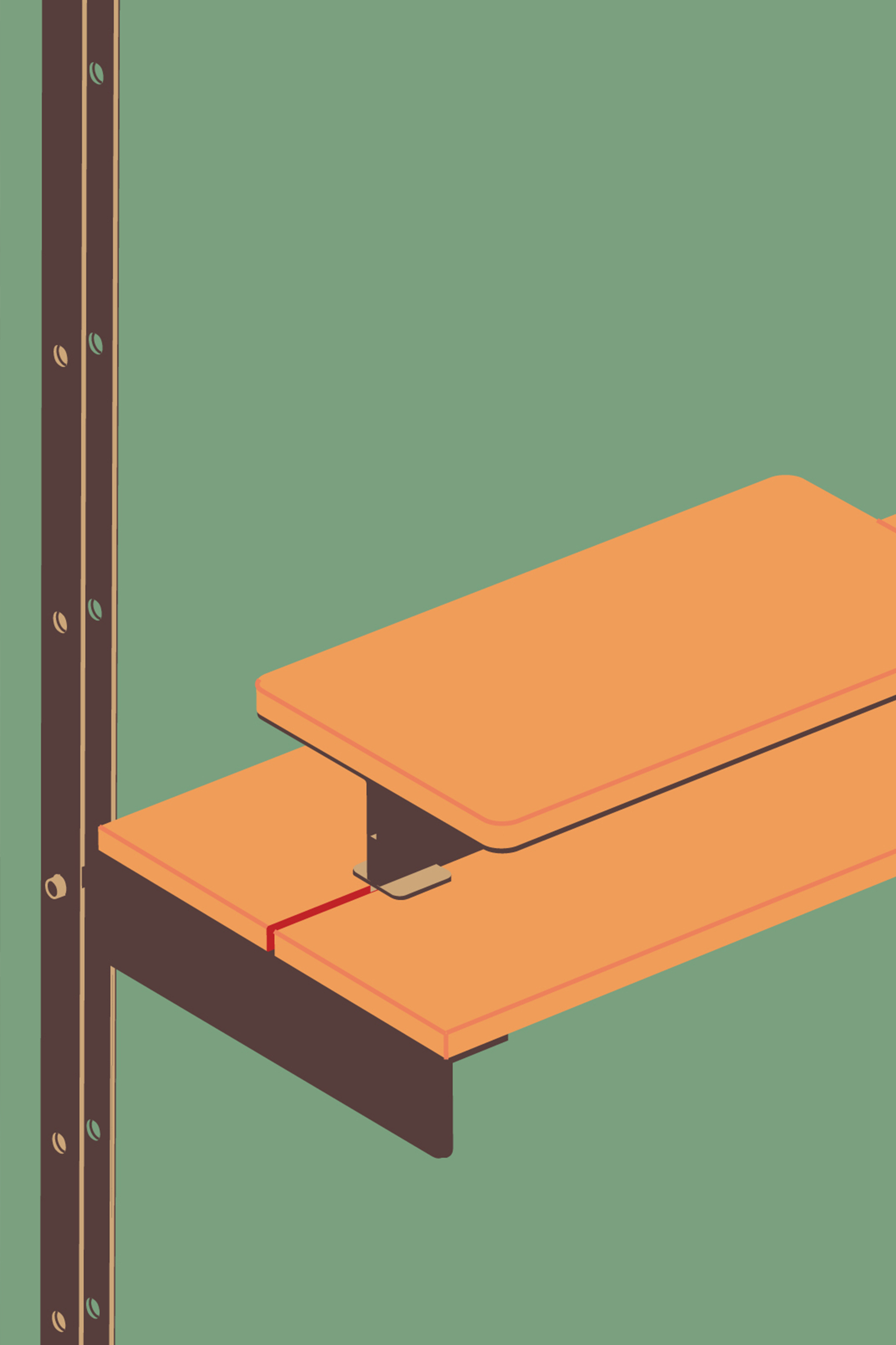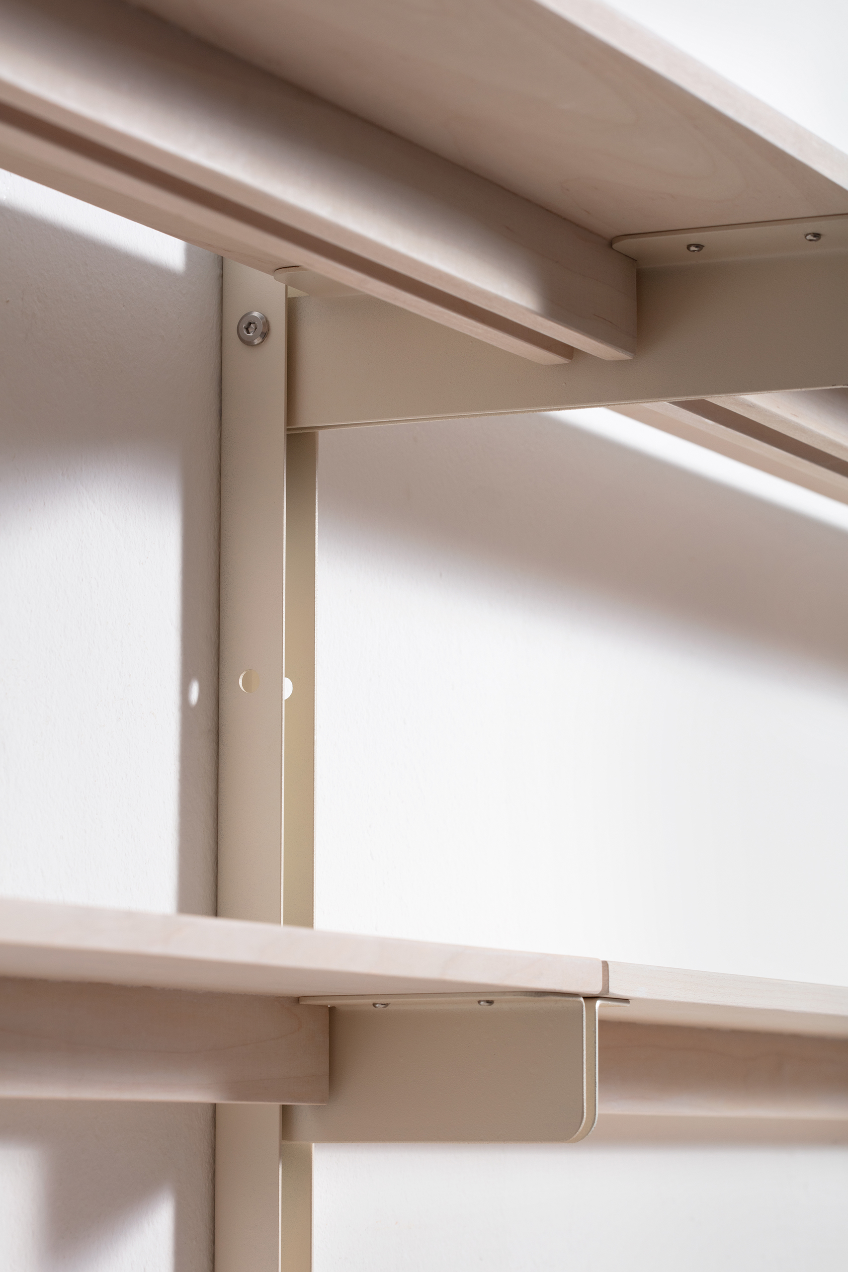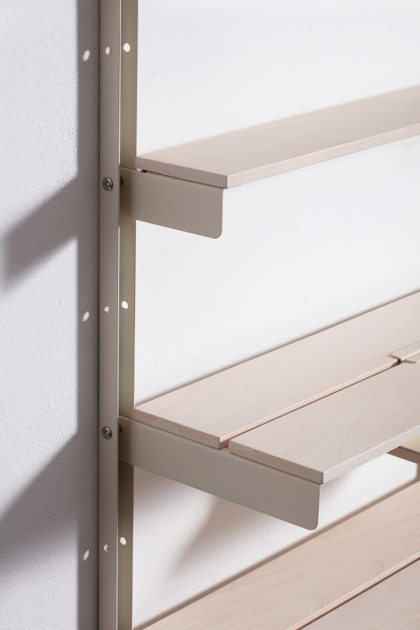 At the centre of the shelving system runs a continuous slit into which modules can be attached from above or below. Through this opening, various add-on elements such as a mini table, a light, a hook, a power outlet, or a bookend can be integrated. This allows the system to be configured according to different needs and adapted to a range of situations.